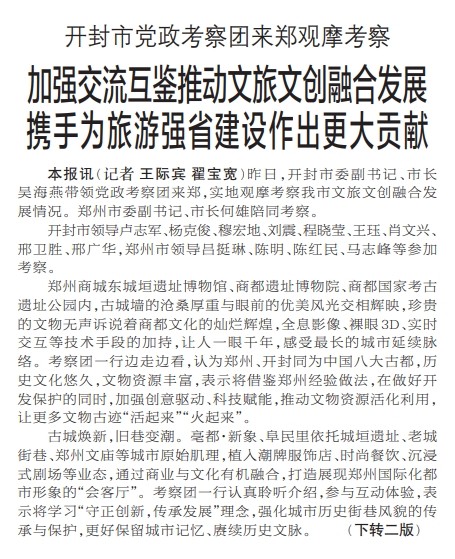 昨日,开封市委副书记、市长吴海燕带领党政考察团来郑,实地观摩考察我市文旅文创融合发展情况。郑州市委副书记、市长何雄陪同考察。(今日《郑州日报》1版、2版)