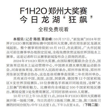 10月17日,“新发展”2024年世界F1H2O摩托艇锦标赛中国郑州大奖赛,将在郑东新区龙湖水域起航。整个赛事将持续到10月19日,在此期间,广大市民观众可前往赛事举办地指定区域,全程免费欣赏这场世界顶级水上赛事。这是记者昨日从赛事新闻发布会上获得的消息。(今日《郑州日报》1版、2版)