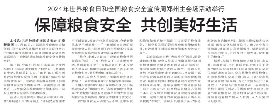 10月16日,由郑州市粮食和物资储备局、郑州农业发展集团有限公司联合举办的2024年世界粮食日和全国粮食安全宣传周郑州市主会场活动在河南粮食安全宣教馆举行。(今日《郑州日报》2版)