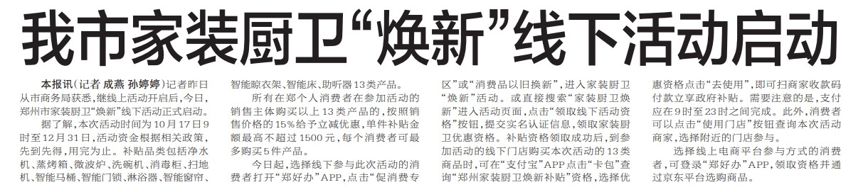 记者昨日从市商务局获悉,继线上活动开启后,今日,郑州市家装厨卫“焕新”线下活动正式启动。(今日《郑州日报》5版)