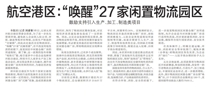 航空港区:“唤醒”27家闲置物流园区