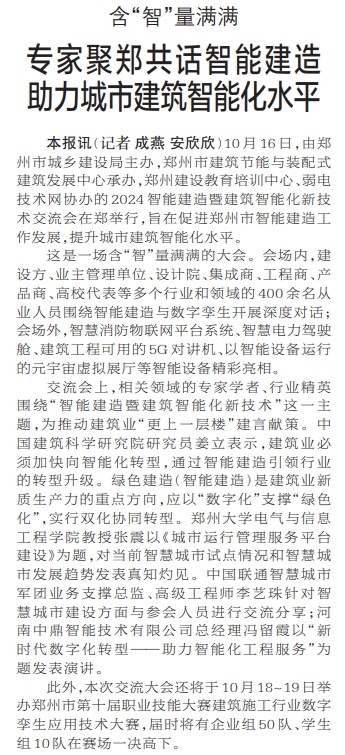 10月16日,由郑州市城乡建设局主办,郑州市建筑节能与装配式建筑发展中心承办,郑州建设教育培训中心、弱电技术网协办的2024智能建造暨建筑智能化新技术交流会在郑举行,旨在促进郑州市智能建造工作发展,提升城市建筑智能化水平。(今日《郑州日报》2版)