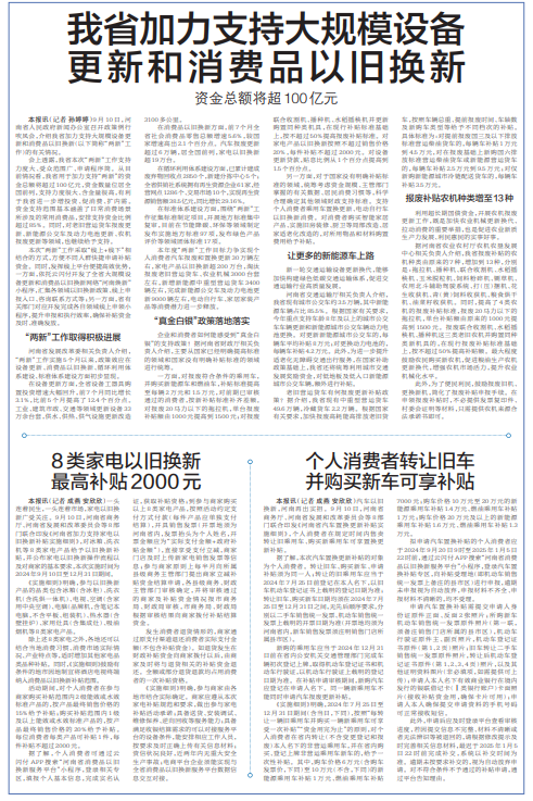 9月10日,河南省人民政府新闻办公室召开政策例行吹风会,介绍我省加力支持大规模设备更新和消费品以旧换新的有关情况。(今日《郑州日报》5版)