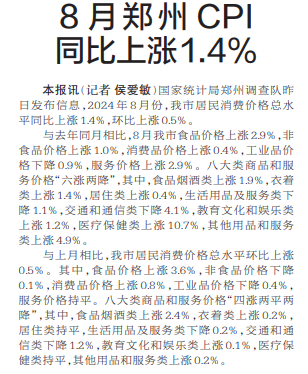 8月郑州CPI同比上涨1.4%