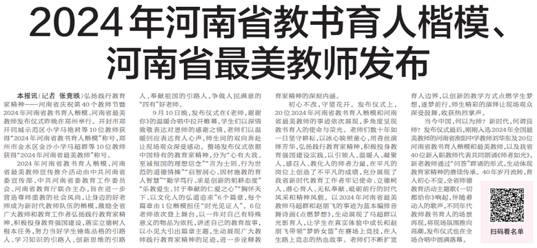 弘扬践行教育家精神——河南省庆祝第40个教师节暨2024年河南省教书育人楷模、河南省最美教师发布仪式昨晚在郑州举行。开封市郑开同城示范区小学马艳君等10位教师获得“2024年河南省教书育人楷模”称号,郑州市金水区金沙小学马超群等10位教师获得“2024年河南省最美教师”称号。(今日《郑州日报》7版)