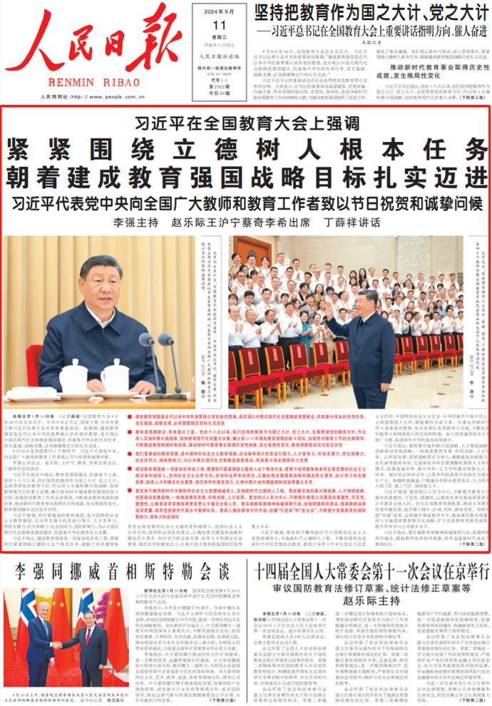 9月9日至10日,全国教育大会在北京召开。习近平总书记出席大会并发表重要讲话强调:“建成教育强国是近代以来中华民族梦寐以求的美好愿望,是实现以中国式现代化全面推进强国建设、民族复兴伟业的先导任务、坚实基础、战略支撑,必须朝着既定目标扎实迈进。”(今日《人民日报》1版、3版)