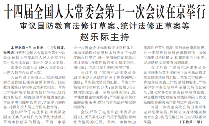审议国防教育法修订草案、统计法修正草案等