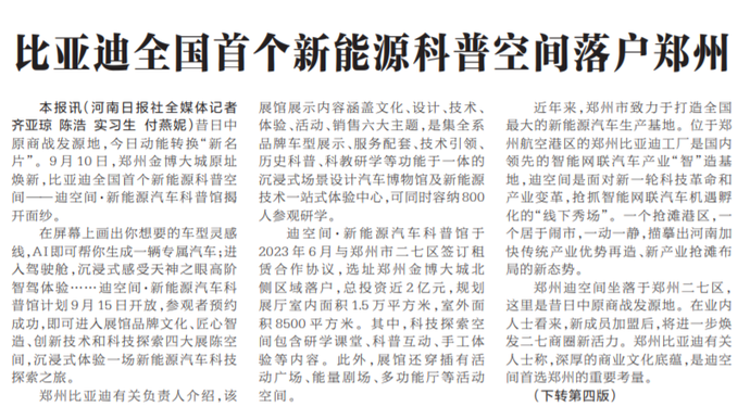 昔日中原商战发源地,今日动能转换“新名片”。9月10日,郑州金博大城原址焕新,比亚迪全国首个新能源科普空间——迪空间·新能源汽车科普馆揭开面纱。(今日《河南日报》1版、4版)