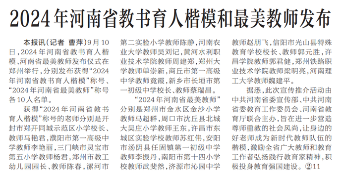 9月10日,2024年河南省教书育人楷模、河南省最美教师发布仪式在郑州举行,分别发布获得“2024年河南省教书育人楷模”称号、“2024年河南省最美教师”称号各10人名单。(今日《河南日报》2版)