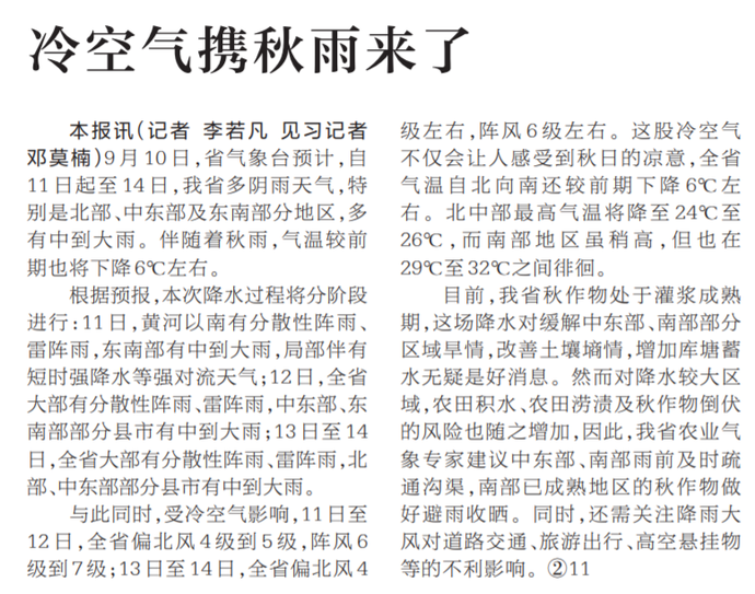 9月10日,省气象台预计,自11日起至14日,我省多阴雨天气,特别是北部、中东部及东南部分地区,多有中到大雨。伴随着秋雨,气温较前期也将下降6℃左右。(今日《河南日报》6版)