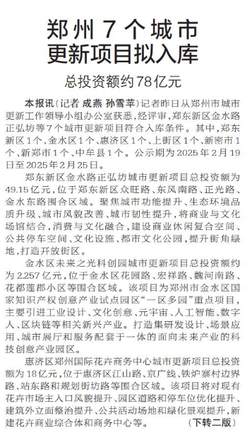 记者昨日从郑州市城市更新工作领导小组办公室获悉,经评审,郑东新区金水路正弘坊等7个城市更新项目符合入库条件。其中,郑东新区1个、金水区1个、惠济区1个、上街区1个、新密市1个、新郑市1个、中牟县1个。公示期为2025年2月19日至2025年2月25日。(今日《郑州日报》1版、2版)