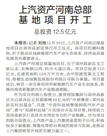 2月19日,上汽资产河南总部基地项目在郑州高新区举行开工仪式。该项目的顺利落地,对于推动区域新能源汽车产业生态体系、经济高质量发展具有重要意义。(今日《郑州日报》1版)