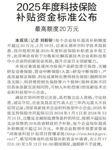 每个企业每年最高补贴额度不超过20万元,2月19日,记者从郑州市科学技术局获悉,我市组织开展2025年度科技保险补贴资金申报工作,此项举动有利于分散和化解高新技术企业和科技型中小企业的创新创业风险,提升企业自主创新能力。(今日《郑州日报》2版)