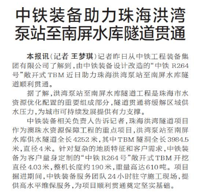 记者昨日从中铁工程装备集团有限公司了解到,由中铁装备设计改造的“中铁 R264 号”敞开式TBM近日助力珠海洪湾泵站至南屏水库隧道顺利贯通。(今日《郑州日报》2版)