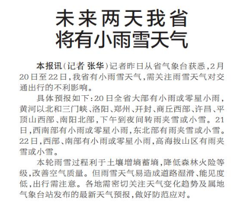 记者昨日从省气象台获悉,2月20日至22日,我省有小雨雪天气,需关注雨雪天气对交通出行的不利影响。(今日《郑州日报》2版)