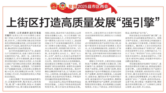 记者从2月19日开幕的上街区第十四届人民代表大会第五次会议上获悉,2025年,上街区将聚力推动低空经济和先进制造业攀高向新,以科技创新引领新质生产力发展,加快现代化产业体系建设,推动经济社会高质量发展。(今日《郑州日报》7版)