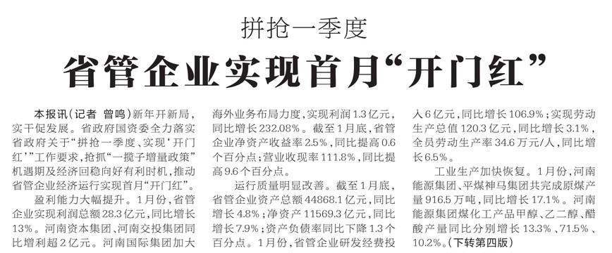 新年开新局,实干促发展。省政府国资委全力落实省政府关于“拼抢一季度、实现‘开门红’”工作要求,抢抓“一揽子增量政策”机遇期及经济回稳向好有利时机,推动省管企业经济运行实现首月“开门红”。(今日《河南日报》1版、4版)
