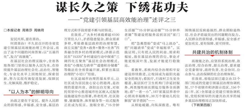 何谓善治?不久前召开的全省党建引领基层高效能治理工作会议,亮出了这个问题的河南答案:以“五基四化”,发力“高效能”。(今日《河南日报》1版、4版)