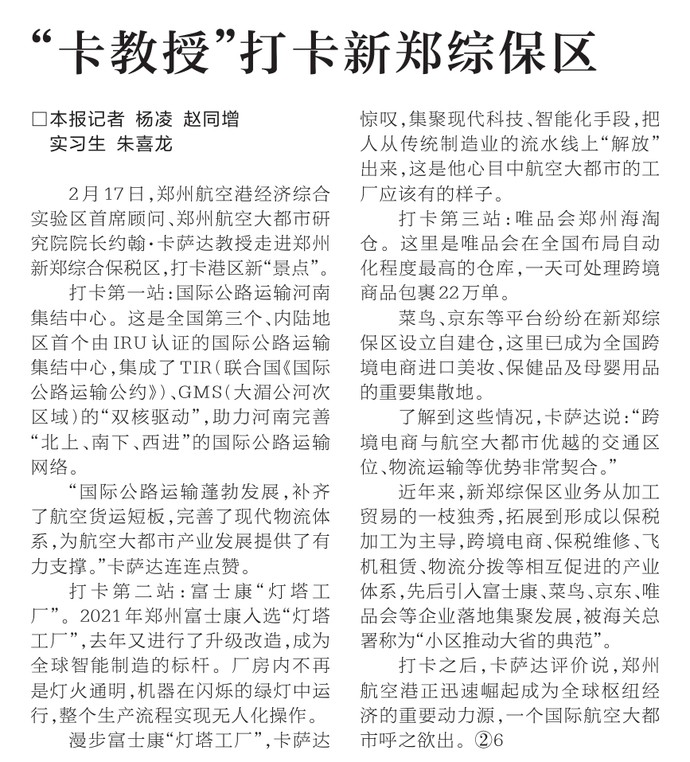 2月17日,郑州航空港经济综合实验区首席顾问、郑州航空大都市研究院院长约翰·卡萨达教授走进郑州新郑综合保税区,打卡港区新“景点”。(今日《河南日报》1版)