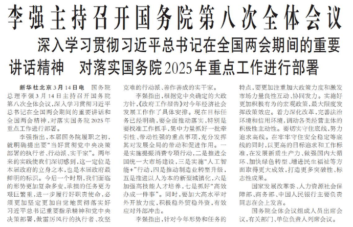 国务院总理李强3月14日主持召开国务院第八次全体会议,深入学习贯彻习近平总书记在全国两会期间的重要讲话和全国两会精神,对落实国务院2025年重点工作进行部署。(今日《人民日报》1版)