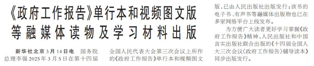《政府工作报告》单行本和视频图文版等融媒体读物及学习材料出版
