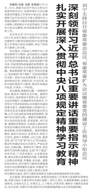 3月13日、14日,省委书记刘宁先后主持召开省委常委会会议、省委常委扩大会议暨省委党的建设工作领导小组会议,深刻领悟习近平总书记关于深入贯彻中央八项规定精神学习教育的重要讲话重要指示精神,贯彻落实中央党的建设工作领导小组会议精神,研究部署我省学习教育工作。(今日《河南日报》1版)