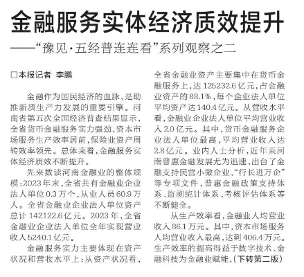 金融作为国民经济的血脉,是助推新质生产力发展的重要引擎。河南省第五次全国经济普查结果显示,全省货币金融服务实力强劲,资本市场服务生产效率居前,保险业资产周转效率领先。总体来看,金融服务实体经济质效不断提升。(今日《河南日报》1版、2版)