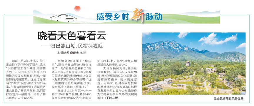阳春三月,山花烂漫。位于嵩山脚下的“禅心居”院内,几名“小武僧”正自挥拳踢腿,动作整齐划一。初升的红日与孩子们矫健的身姿交相辉映,形成一幅独特的美丽画面。这座远近闻名的“禅修”民宿,加入了“武”元素,在春节期间吸引了大量游客来此体验。“禅武不分家,我们要打造别具一格的嵩山民宿。”禅心居负责人告诉记者。(今日《郑州日报》1版、2版)
