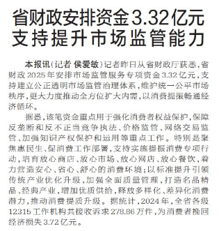 记者昨日从省财政厅获悉,省财政2025年安排市场监管服务专项资金3.32亿元,支持建立公正透明市场监管治理体系,维护统一公平市场秩序,更大力度推动全方位扩大内需,以消费提振畅通经济循环。(今日《郑州日报》1版)