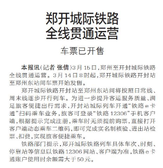3月15日,郑州至开封城际铁路全线贯通运营。3月14日8时起,郑开城际铁路开封站至郑州东站间车票开始发售。(今日《郑州日报》1版)