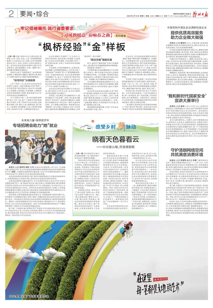 “枫”染千门暖,“桥”渡百姓难。以“枫桥经验”为指南,郑州市金水区持续建设民心工程,坚持群众的需求在哪里,公共服务就跟进到哪里,功夫就下足到哪里,全身心化解基层矛盾纠纷,春风化雨式地浸润民心。“枫桥经验”与金水实际“丝滑般”契合,书写出国泰民安的锦绣华章,绽放出和煦春风中的灿烂之花。(今日《郑州日报》1版、2版)