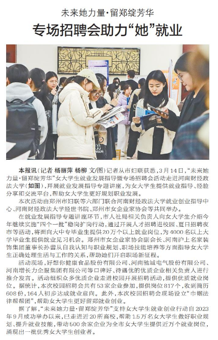 记者从市妇联获悉,3月14日,“未来她力量·留郑绽芳华”女大学生就业发展指导暨专场招聘会活动走进河南财经政法大学,开展就业发展指导专题讲座,为女大学生提供就业指导、经验分享和交流平台,帮助女大学生更好规划职业发展。(今日《郑州日报》2版)