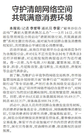 “刷单炒信合法吗”“遇到大数据杀熟怎么办”……3月14日,市市场监管局网监分局启动“清朗网络空间,共筑满意消费”系列主题宣传活动,面对面为市民群众普及消费维权知识,共同营造公平诚信放心消费环境。(今日《郑州日报》2版)