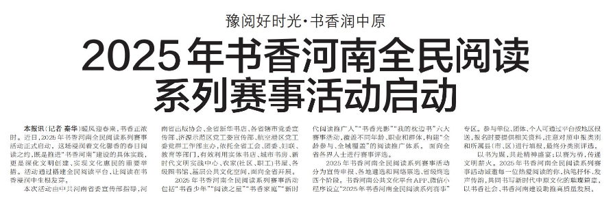 暖风迎春来,书香正浓时。近日,2025年书香河南全民阅读系列赛事活动正式启动。这场浸润着文化馨香的春日阅读之约,既是推进“书香河南”建设的具体实践,更是深化文明创建、实现文化惠民的重要举措。活动通过搭建全民阅读平台,让阅读在书香浸润中生根发芽。(今日《郑州日报》4版)