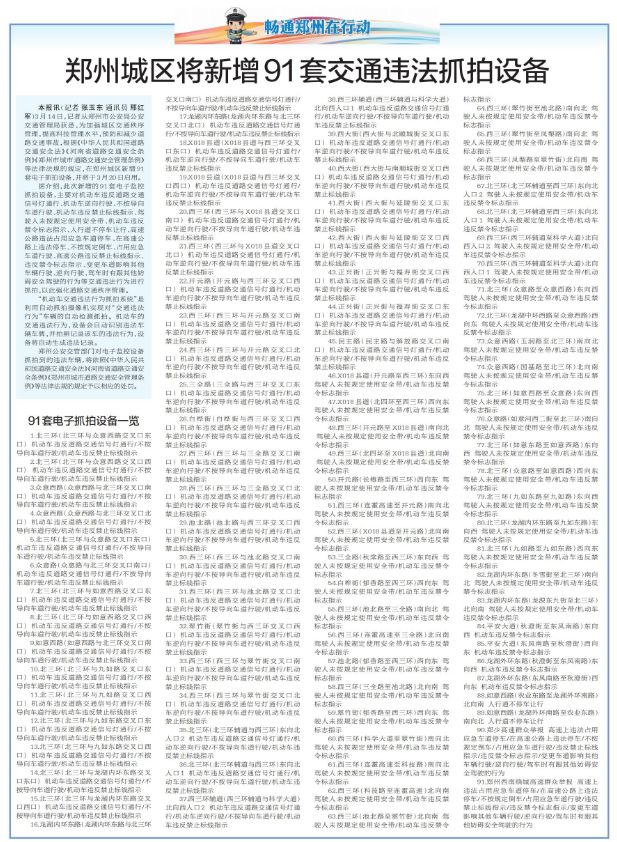 3月14日,记者从郑州市公安局公安交通管理局获悉,为加强城区交通秩序管理,提高科技管理水平,预防和减少道路交通事故,根据《中华人民共和国道路交通安全法》《河南省道路交通安全条例》《郑州市城市道路交通安全管理条例》等法律法规的规定,在郑州城区新增91套电子抓拍设备,并将于3月20日启用。(今日《郑州日报》4版)