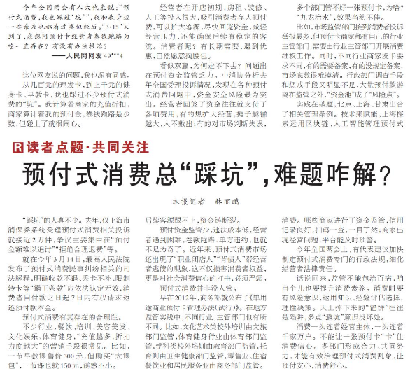 今年全国两会有人大代表说:“预付式消费,我也踩过‘坑’”,我和我身边一些亲友也都有过类似经历。“3·15”又到了,我想问预付卡经营者卷钱跑路为啥一直存在?有没有办法根治?(今日《人民日报》1版)