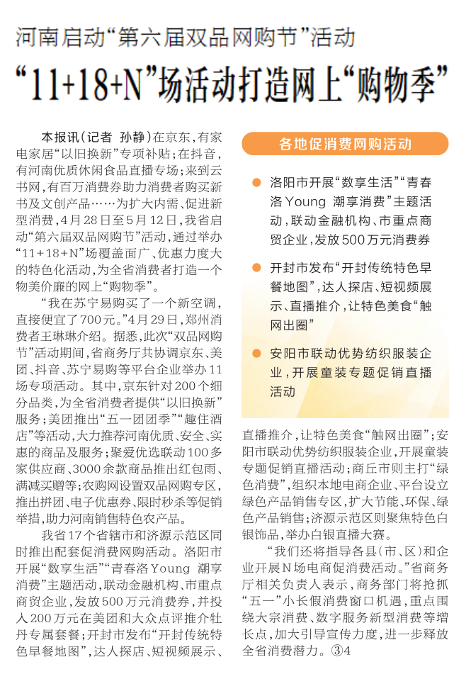 在京东,有家电家居“以旧换新”专项补贴;在抖音,有河南优质休闲食品直播专场;来到云书网,有百万消费券助力消费者购买新书及文创产品……为扩大内需、促进新型消费,4月28日至5月12日,我省启动“第六届双品网购节”活动,通过举办“11+18+N”场覆盖面广、优惠力度大的特色化活动,为全省消费者打造一个物美价廉的网上“购物季”。(今日《河南日报》1版)