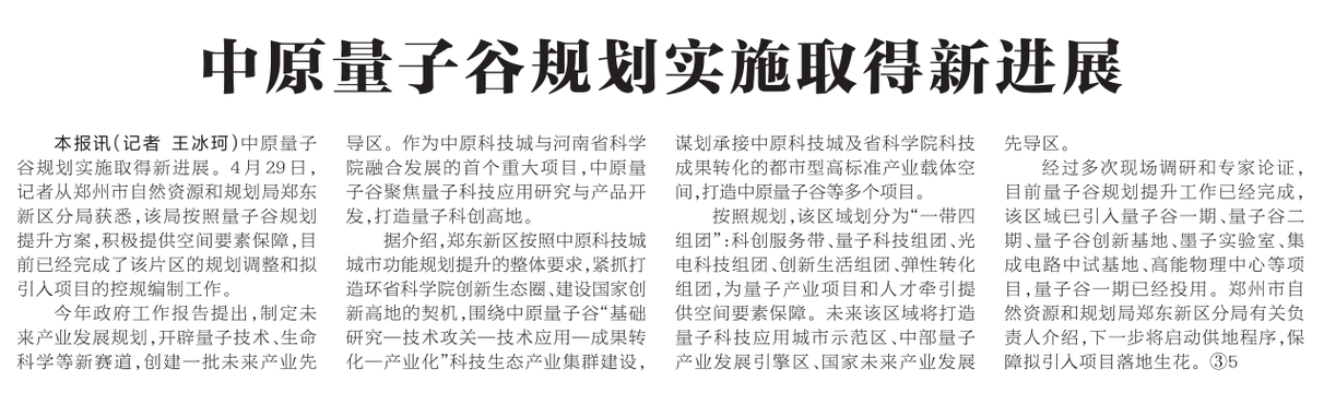 中原量子谷规划实施取得新进展。4月29日,记者从郑州市自然资源和规划局郑东新区分局获悉,该局按照量子谷规划提升方案,积极提供空间要素保障,目前已经完成了该片区的规划调整和拟引入项目的控规编制工作。(今日《河南日报》1版)