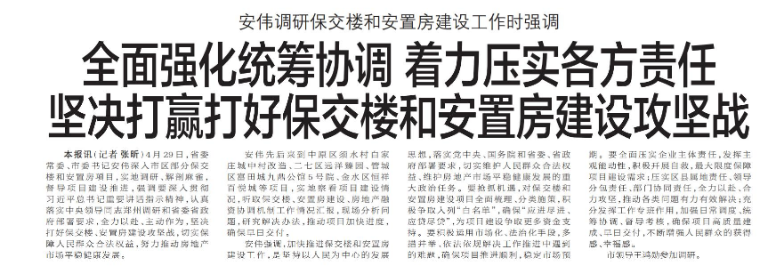 4月29日,省委常委、市委书记安伟深入市区部分保交楼和安置房项目,实地调研、解剖麻雀,督导项目建设推进,强调要深入贯彻习近平总书记重要讲话指示精神,认真落实中央领导同志郑州调研和省委省政府部署要求,全力以赴、主动作为,坚决打好保交楼、安置房建设攻坚战,切实保障人民群众合法权益,努力推动房地产市场平稳健康发展。(今日《郑州日报》1版)