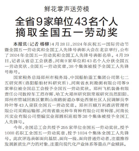 4月28日,2024年庆祝五一国际劳动节暨全国五一劳动奖和全国工人先锋号表彰大会在北京举行,公布了2024年全国五一劳动奖和全国工人先锋号表彰名单。4月29日,记者从省总工会获悉,河南9家单位和43名个人分获全国五一劳动奖状、全国五一劳动奖章,38个集体被授予全国工人先锋号称号。(今日《郑州日报》1版)