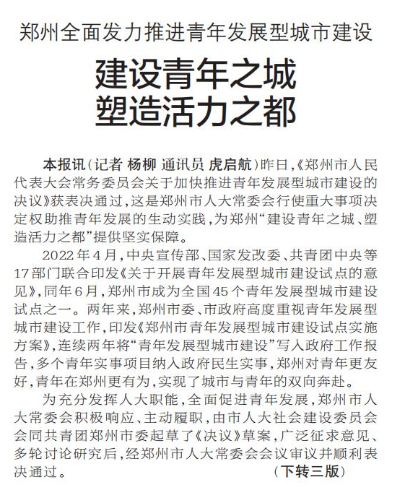 为高质量推进我市青年发展型城市建设,推动全社会积极践行青年优先发展理念,优化青年成长环境,促进青年全面发展,着力实现广大青年与郑州国家中心城市现代化建设互融提升,依据国家、省有关规定,结合我市实际,作出如下决议:(今日《郑州日报》2版)