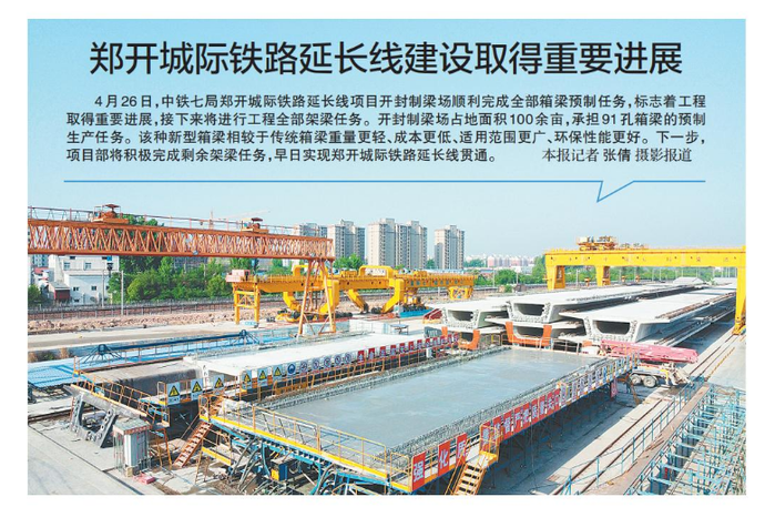 4月26日,中铁七局郑开城际铁路延长线项目开封制梁场顺利完成全部箱梁预制任务,标志着工程取得重要进展,接下来将进行工程全部架梁任务。开封制梁场占地面积100余亩,承担91孔箱梁的预制生产任务。该种新型箱梁相较于传统箱梁重量更轻、成本更低、适用范围更广、环保性能更好。下一步,项目部将积极完成剩余架梁任务,早日实现郑开城际铁路延长线贯通。(今日《郑州日报》1版)