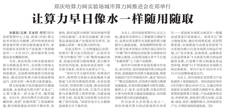 郑州高新智算中心上线、商周(河南)算力技术有限公司揭牌、郑州哈密就协同推进城市算力网实验场建设签约、郑州高新区支持算力产业发展十条措施发布……4月28日,郑州城市算力网建设迎来耀眼时刻。(今日《河南日报》2版)