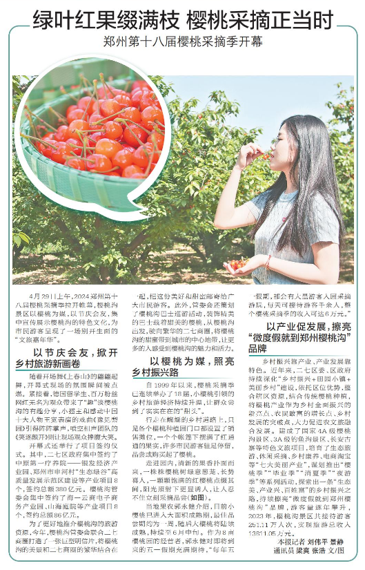 4月29日上午,2024郑州第十八届樱桃采摘季拉开帷幕,樱桃沟景区以樱桃为媒,以节庆会友,集中宣传展示樱桃沟的特色文化,为市民游客呈现了一场别开生面的“文旅嘉年华”。(今日《郑州日报》3版)