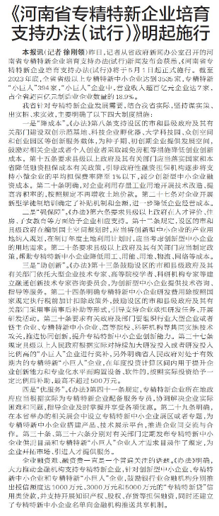 《河南省专精特新企业培育支持办法(试行)》明起施行