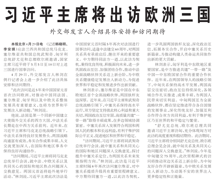 4月29日,外交部发言人林剑在例行记者会上进一步介绍了此访具体安排和访问期待。(今日《人民日报》1版)