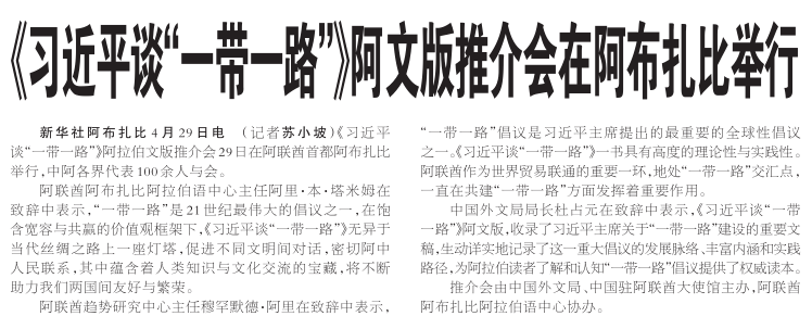 《习近平谈“一带一路”》阿拉伯文版推介会29日在阿联酋首都阿布扎比举行,中阿各界代表100余人与会。(今日《人民日报》1版)