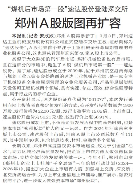 郑州A股再添新丁!9月3日,郑州速达工业机械服务股份有限公司正式登陆深交所主板,证券简称为“速达股份”,A股迎来首个专注于工业机械全寿命周期管理的专业化服务公司,这也意味着郑州迎来第40家A股上市公司。(今日《郑州日报》1版)