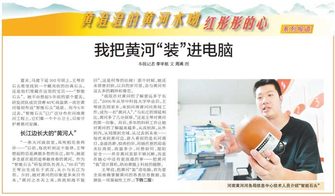 夏末,马渡下延102号坝上,王琴在石头堆里找到一个椰壳状的仿真石头,这是他们埋藏在这里的宝贝——“智能石头”。她不由想起5年前的那个夏天,研发团队成员顶着40℃高温第一次在黄河堤坝布设“智能石头”场景。而今5年过去,“智能石头”已广泛分布在河南黄河工程上,它们像一个个小卫士,日夜守护着黄河安澜。(今日《郑州日报》1版、2版)