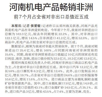记者昨日从郑州海关获悉,河南产品尤其是机电产品在非洲受到欢迎。今年前7个月,我省对非洲进出口总额为163.3亿元,较去年同期增长22.2%。其中,对非洲出口122.1亿元,增长14.5%;自非洲进口41.2亿元,增长52.8%。出口商品中,机电产品占到全省对非出口总值的近五成。(今日《郑州日报》1版)